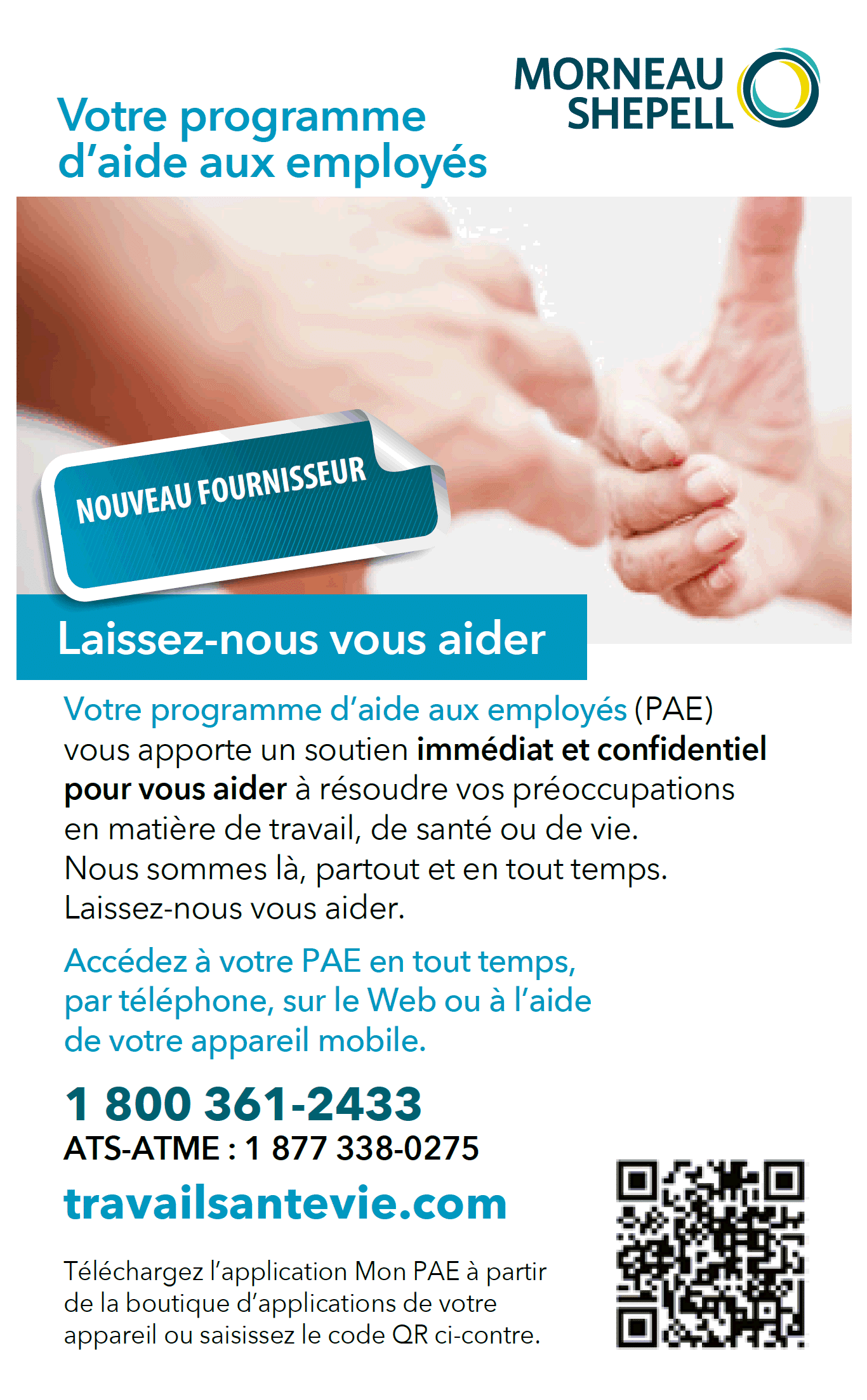 Une vie équilibrée repose sur un mieux-être complet. Bien que le stress fasse partie de la vie quotidienne, il est important de reconnaître quand des situations créent des distractions ou sont la source d’inquiétude. Votre PAE vous apporte un soutien immédiat et confidentiel pour vous aider à résoudre vos préoccupations. Nous sommes là, partout et en tout temps. Laissez-nous vous aider.